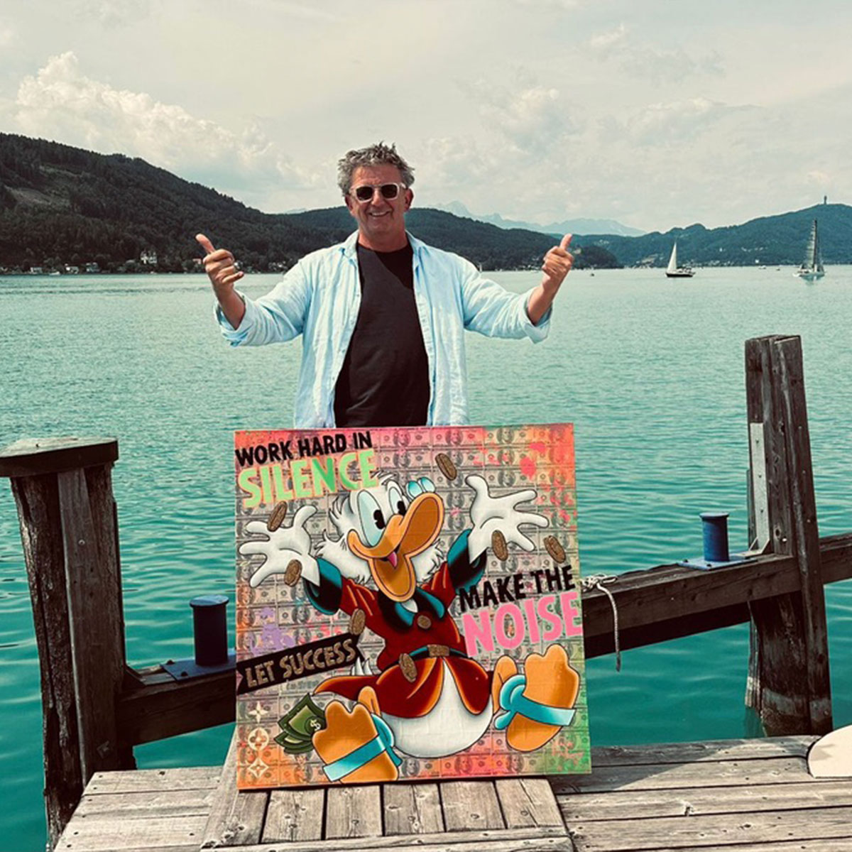 Mit diesem Werk möchte ich auf humorvolle und dennoch nachdenkliche Weise zeigen, was für mich der wahre Weg zum Erfolg ist: Still sein, fokussiert arbeiten und die Resultate für sich sprechen lassen. Onkel Dagobert – eine meiner Lieblingsfiguren – steht hier stellvertretend für den cleveren Hustler, der mit Disziplin, Ehrgeiz und ein bisschen Glück seinen ganz eigenen Weg geht. Dass er dabei in Geld badet, ist natürlich typisch Pop-Art – plakativ, überspitzt, aber auch eine kleine Satire auf unsere Leistungsgesellschaft.Der Satz „Work hard in silence – let success be your noise“ bringt für mich genau das auf den Punkt: Nicht laut reden, nicht angeben – einfach machen. Und irgendwann wird dein Erfolg so laut, dass alle es hören.