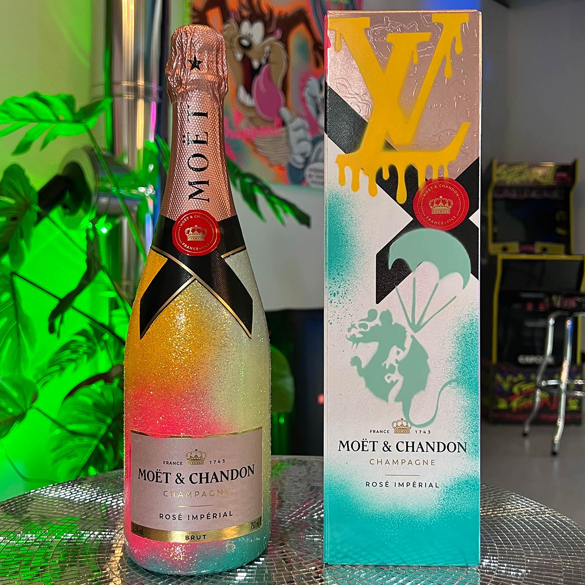 Die Kombination aus einer ikonischen Champagnerflasche, Streetart-Elementen à la Banksy und meinem typischen artmaja©-Stil bringt genau das auf den Punkt: Konsum trifft Kunst, Glanz trifft Haltung. Ich möchte dem Betrachter eine neue Perspektive auf Wert und Ästhetik geben – und vielleicht ein kleines Augenzwinkern hinterlassen. 🥂✨