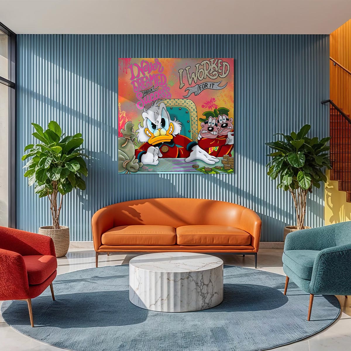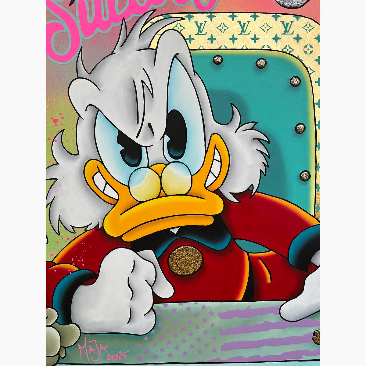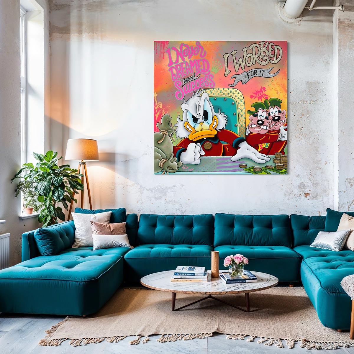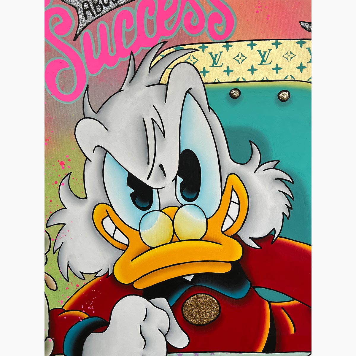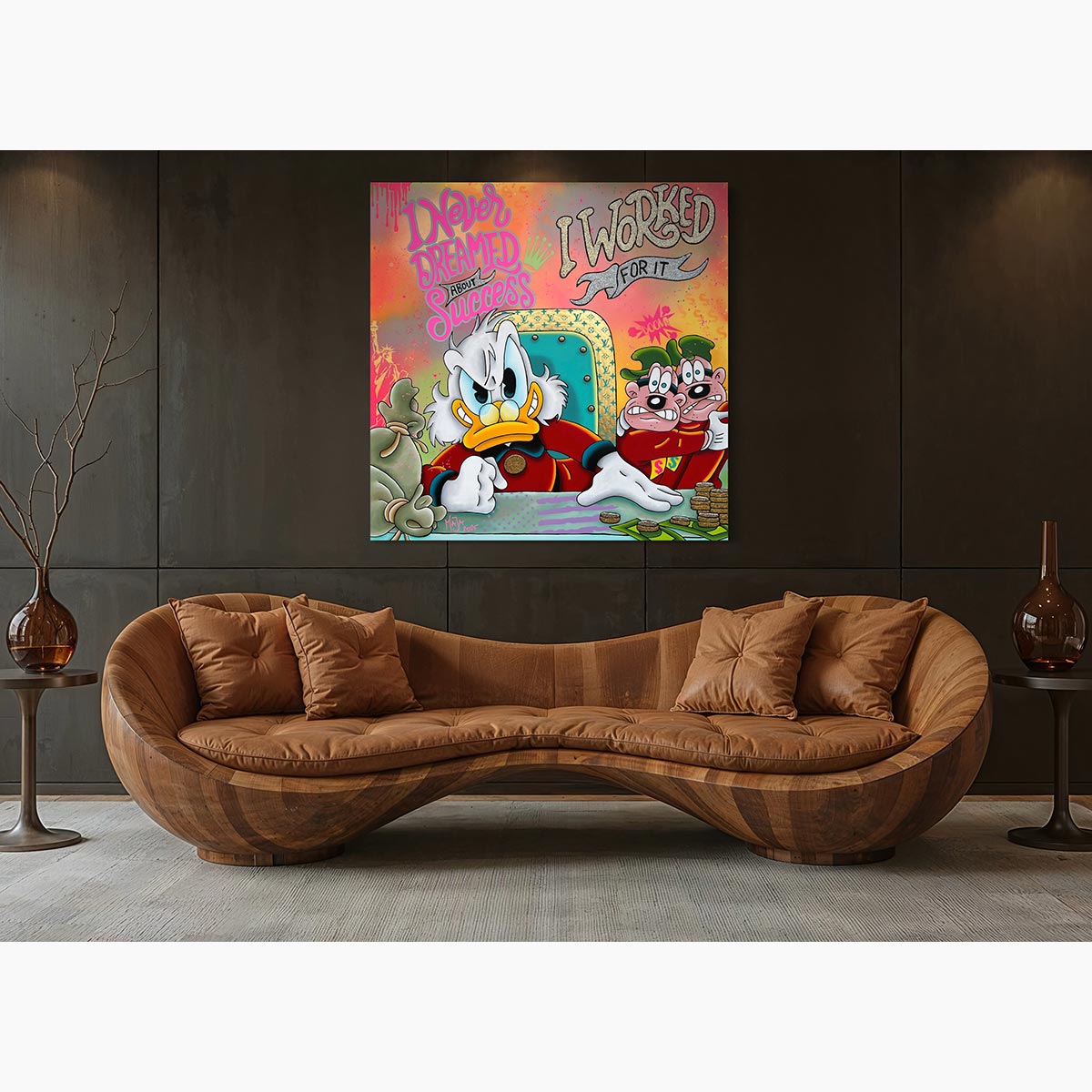 Mit diesem Werk möchte ich zeigen, dass Erfolg nichts mit Zufall oder Glück zu tun hat. Erfolg ist das Ergebnis von Leidenschaft, Disziplin und harter Arbeit – genau das verkörpert Onkel Dagobert für mich. Er träumt nicht vom Erfolg, er arbeitet dafür. Und genau diese Haltung – dieses unermüdliche Streben nach den eigenen Zielen – möchte ich mit diesem Bild an den Betrachter weitergeben.